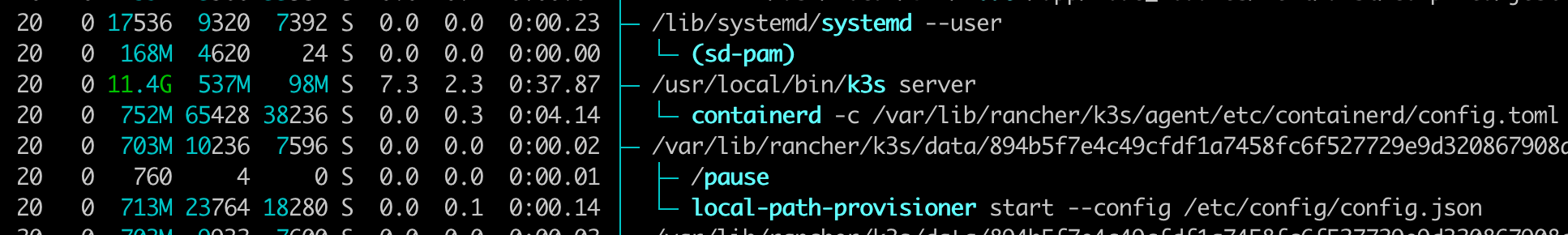 集群启动后可以看到只运行了 k3s 进程,并启动了 containerd 子进程。