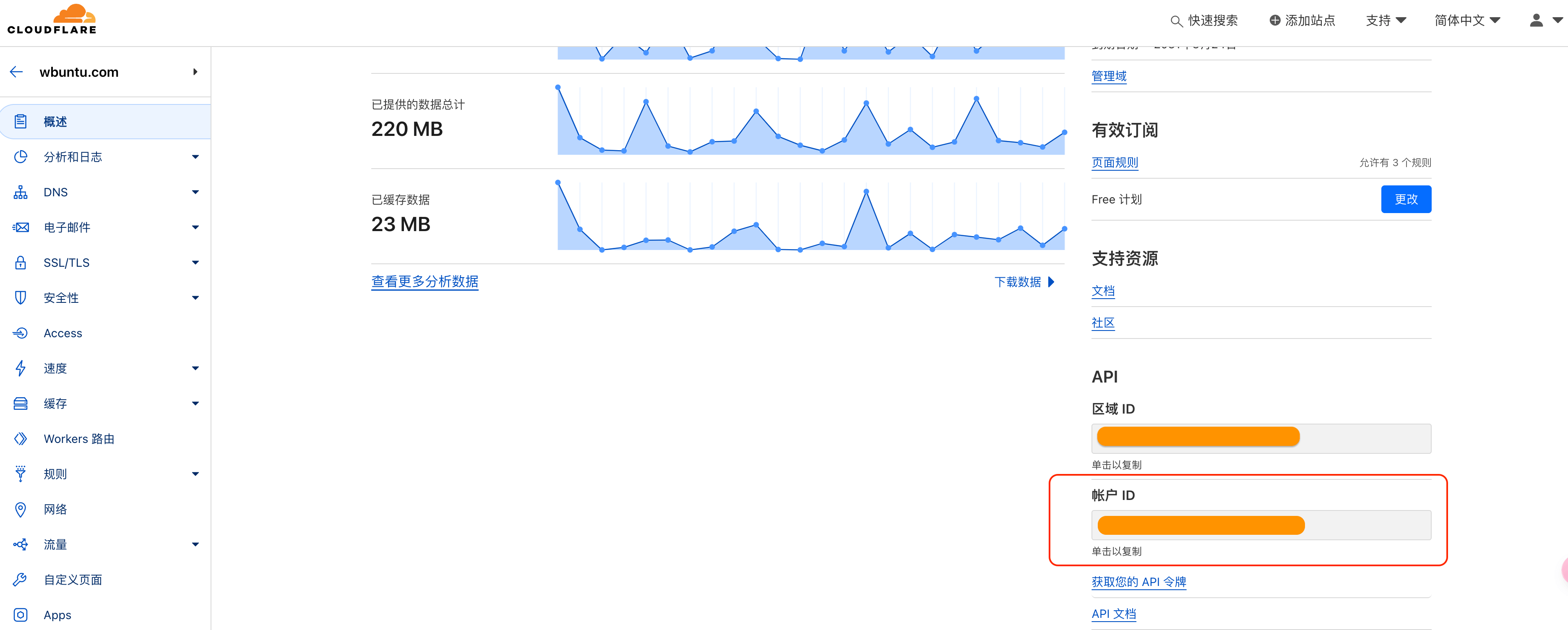 然后选择一个域名进入首页可以查看到账户 ID