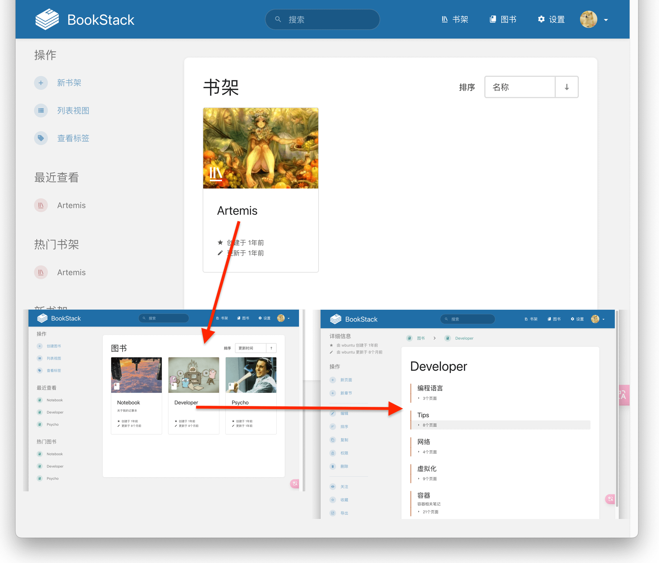bookstack 的内容组织是按照图书馆的方式进行的,我们需要创建一个书架,然后在书架上存放图书,最后在图书中创建章节或者页面。