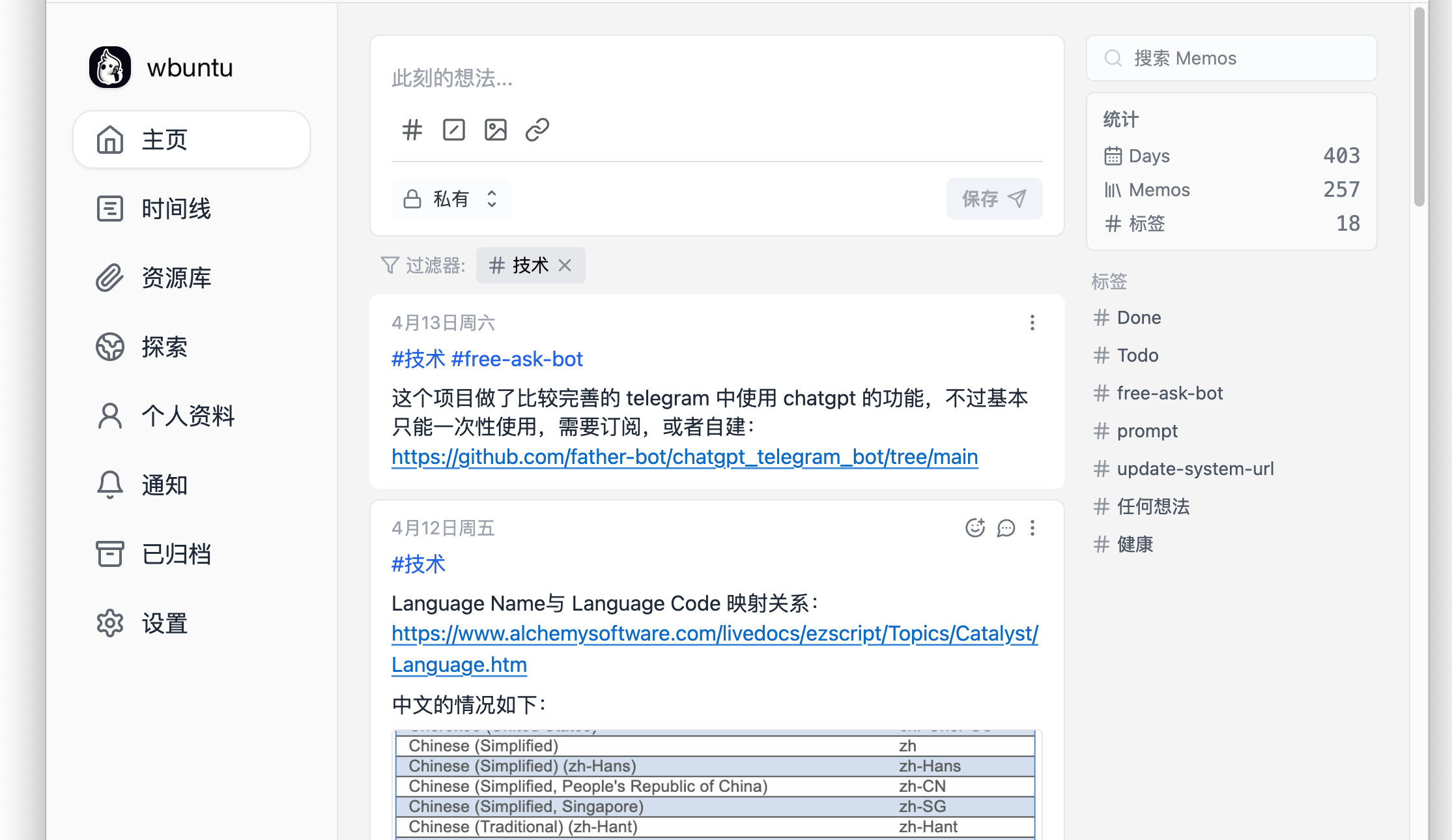 usememos 一直处于积极开发中,一些实验性功能添加了又移除,界面也做过多次调整,但核心的功能还是不变,可以像使用推特或者微博一样记录想法。