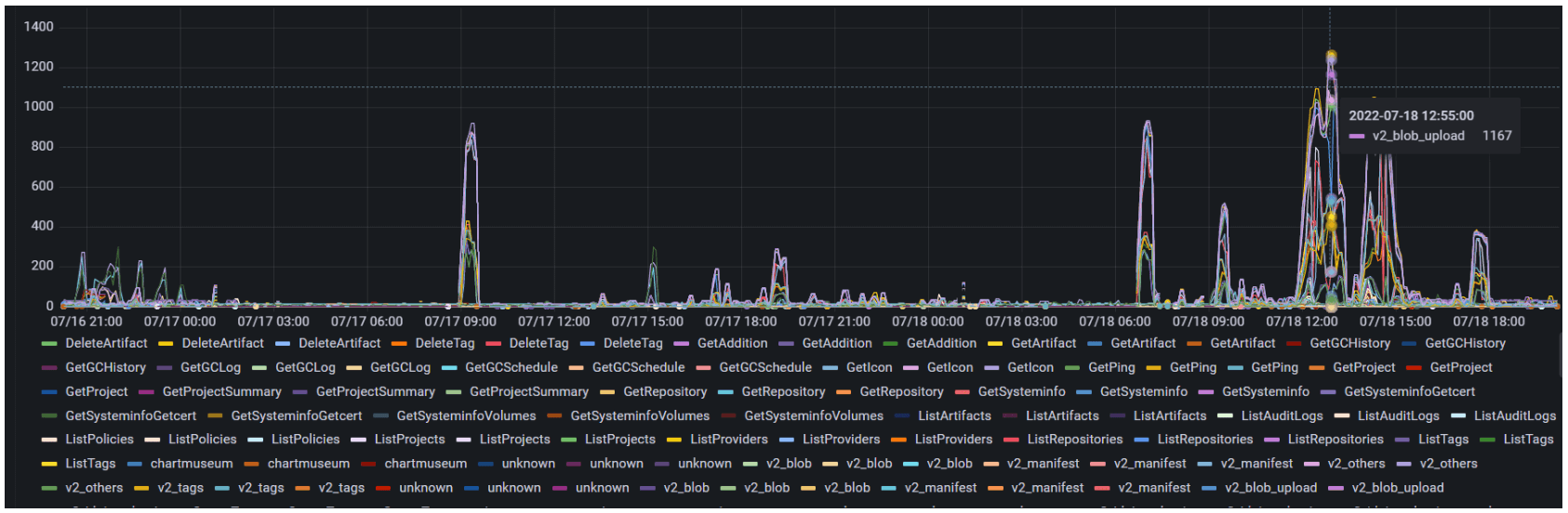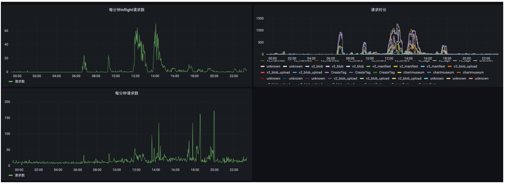 - 从 grafana 记录的日志看,v2_blob_upload(PUT > PATCH > POST)、v2_blob、v2_manifest 等接口存在超长执行时间,高达 1000s 及以上,与推送镜像超时的现象匹配