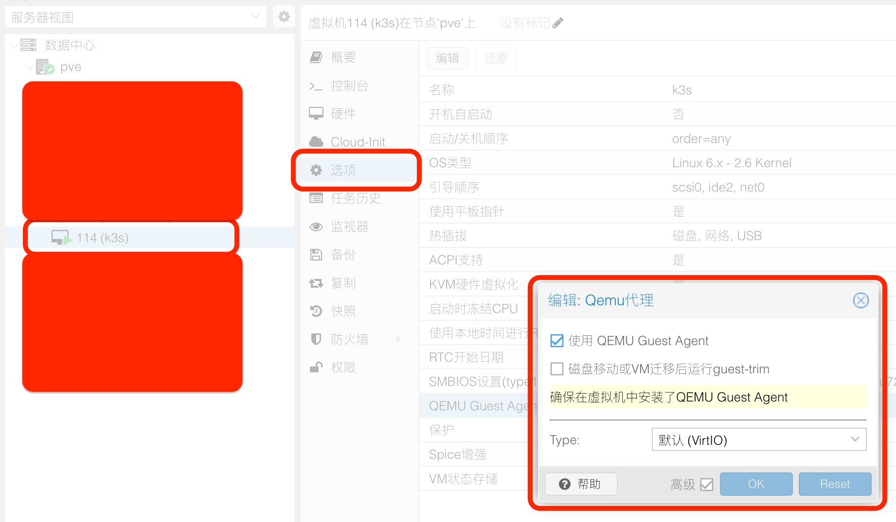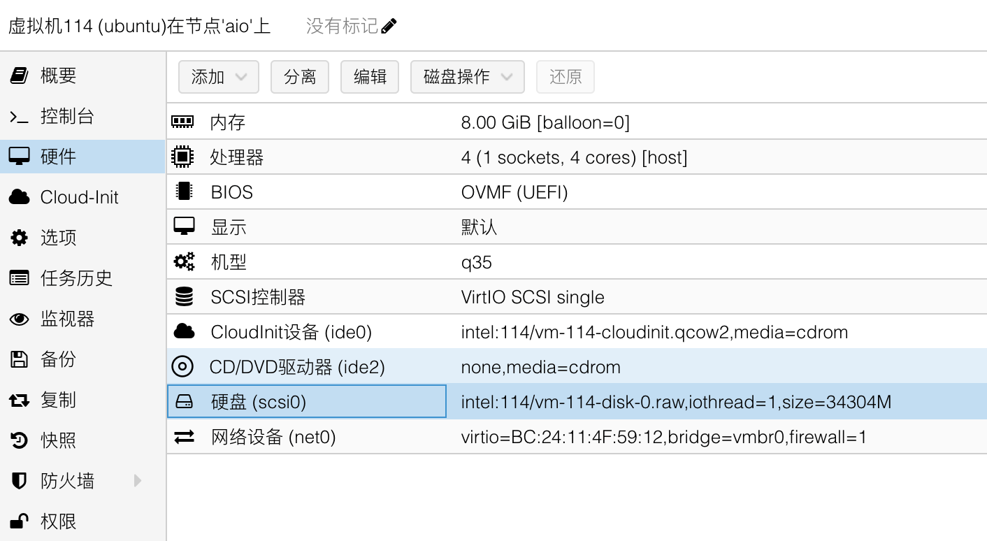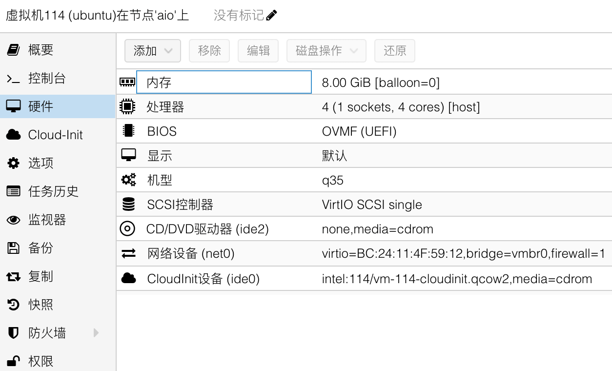 首先创建一台不添加系统盘和 EFI 磁盘的 q35 虚拟机,虚拟机 ID 为 114,这里添加了一个 cloudinit 设备用于初始化系统: