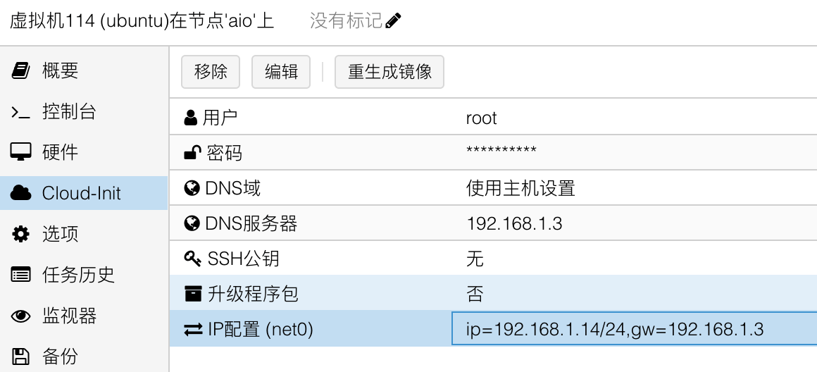 然后修改 Cloud-init 配置,设置用户名、密码和 IP (不升级程序包,避免启动时因为网络问题阻塞),再点击重新生成镜像: