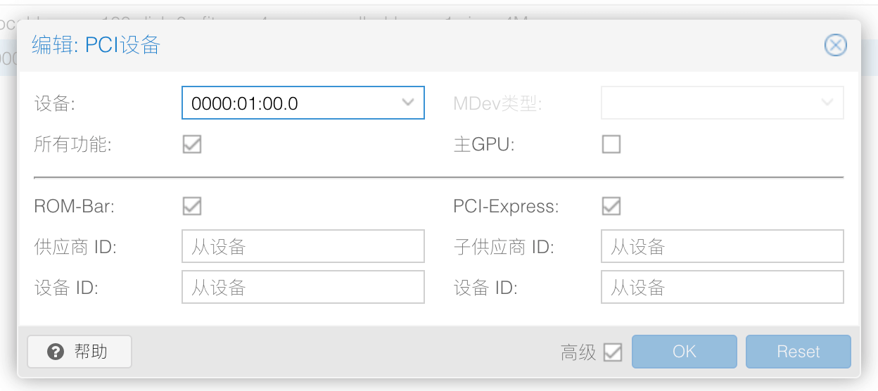 创建虚拟机完成后,选择添加 PCI 设备,选中显卡对应的设备,我们不需要使用显卡输出视频,只作为视频、AI 加速卡使用,这里就不勾选主 GPU: