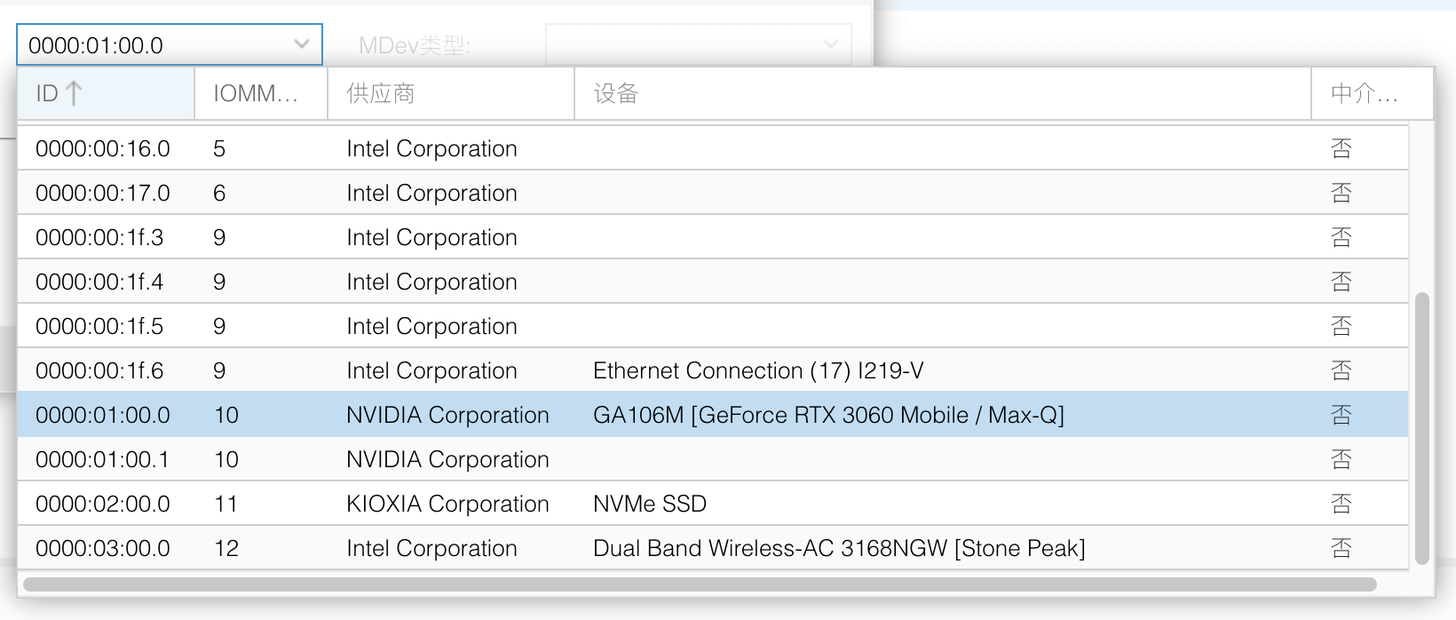 │ 0x030000 │ 0x2520 │ 0000:01:00.0 │ 10 │ 0x10de │ GA106M [GeForce RTX 3060 Mobile / Max-Q] │ │ 0x0000 │ │ 0x10de │ NVIDIA Corporation │ NVIDIA Corporation │