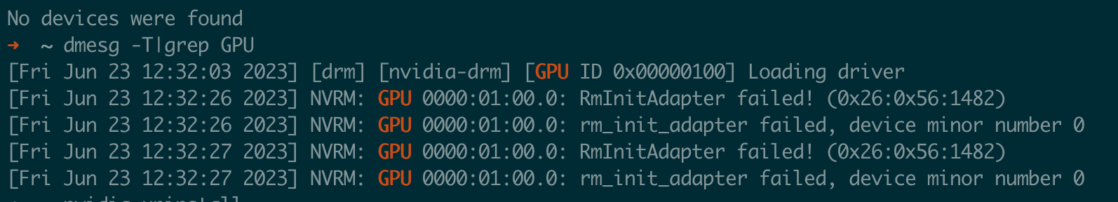 如果虚拟机系统里已经安装了 N 卡驱动,在 dmesg 中看到 rm_init_adapter failed 的错误信息,说明显卡无法驱动: