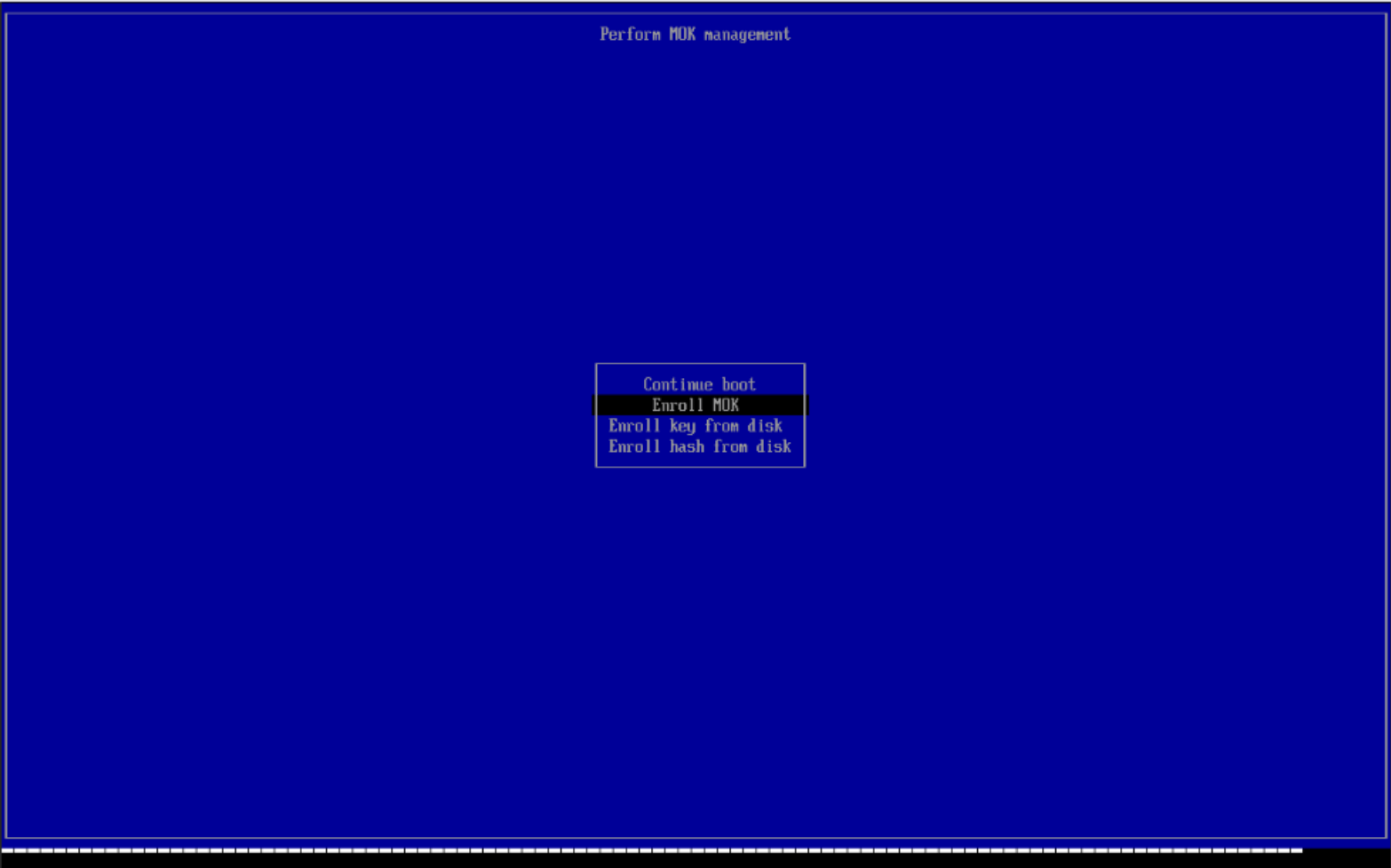 安装完成后重启系统,在 BIOS 页面会提示配置 MOK,选择 Enroll MOK 后输入密码即可: